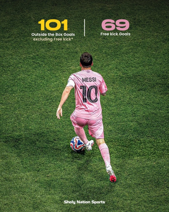 据统计,这是梅西生涯第101粒禁区外运动战进球,历史第一。此外梅西生涯目前还进了69个任意球。